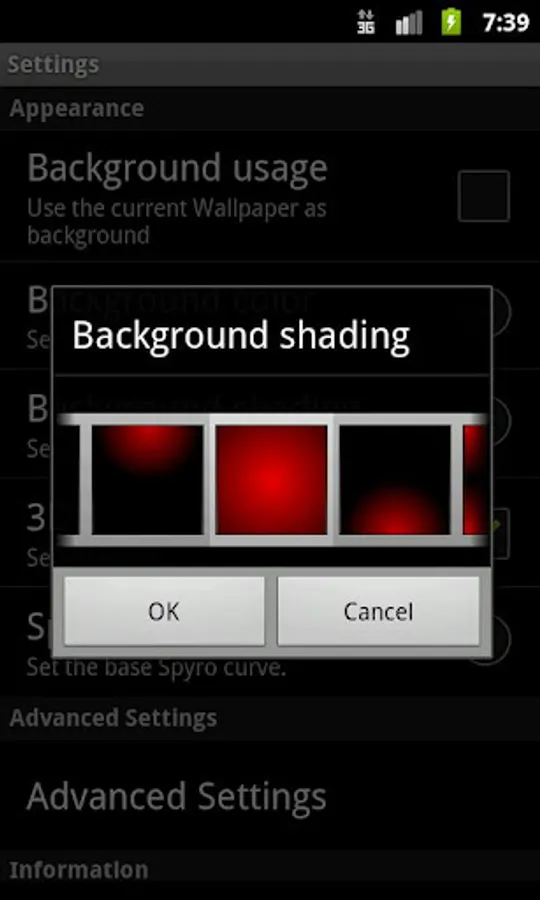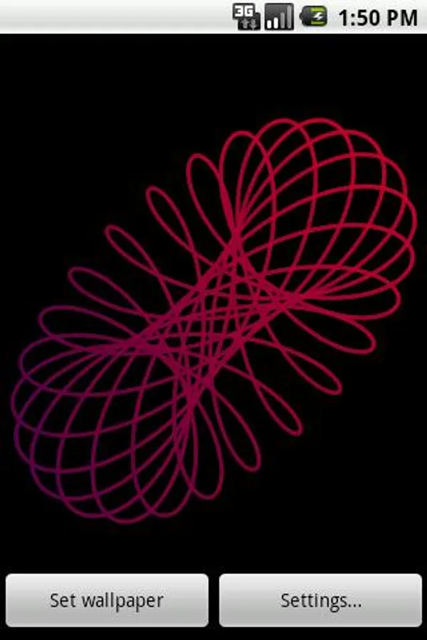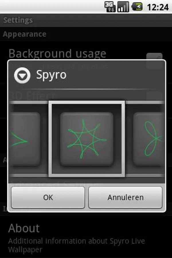 The free Spyro Live Wallpaper displays an animated spirograph. You can tap on the screen to alter the curve. You can choose to use your current background wallpaper or select one of the background shadings, whether you would like to have 2D or 3D effect and four different base Spyro curves. The color shading, accuracy, speed and curve stroke can be altered as desired. Double tap on the Spyro to save it as an image.
