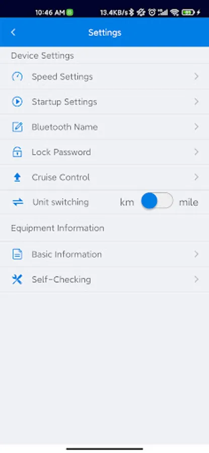Of course,you can also control the cruise status, adjust the speed, modify the Bluetooth name, and modify the lock password through the APP on the settings page.