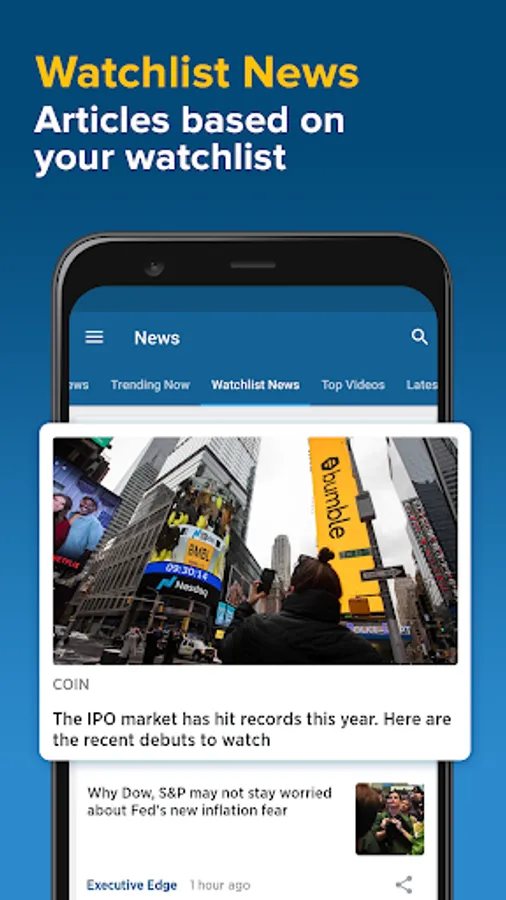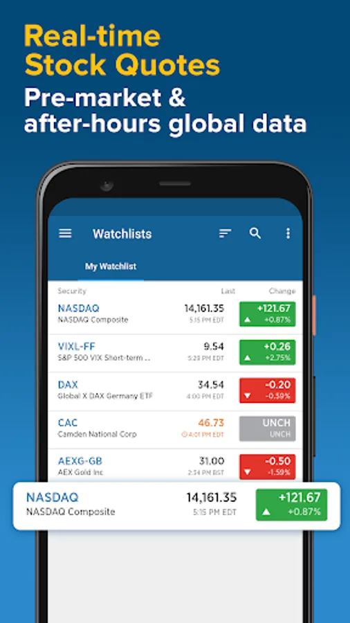 Following stocks and keeping up with the market is easier than ever with our mobile app. Stocks are easily tracked in customizable watchlists so you can get real-time stock market quotes and global market data on your phone throughout the day. View trading data pre-market and after-hours, with charts with customizable time frames, all from your mobile device.