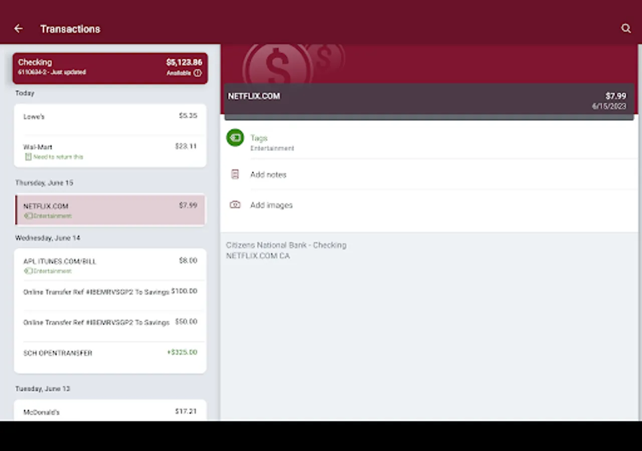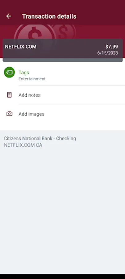 Add Tags, Notes, Images & Geo-Information: By enhancing transactions with custom tags, notes or photos of a receipt or check, you have the ability to stay organized and find exactly what you’re looking for when searching through your finances.