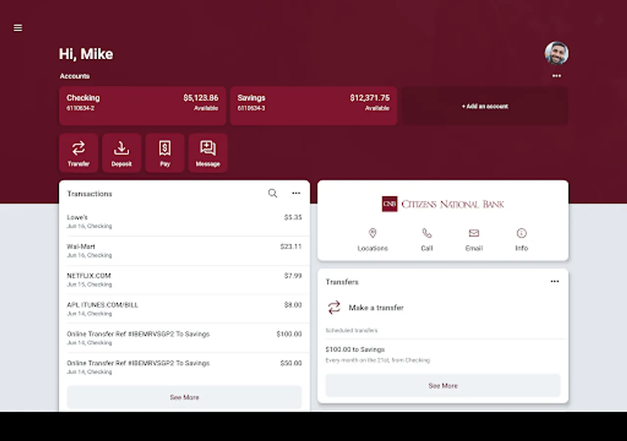 Contact: Locate ATMs or branches and contact Citizens National Bank customer service directly from the app.