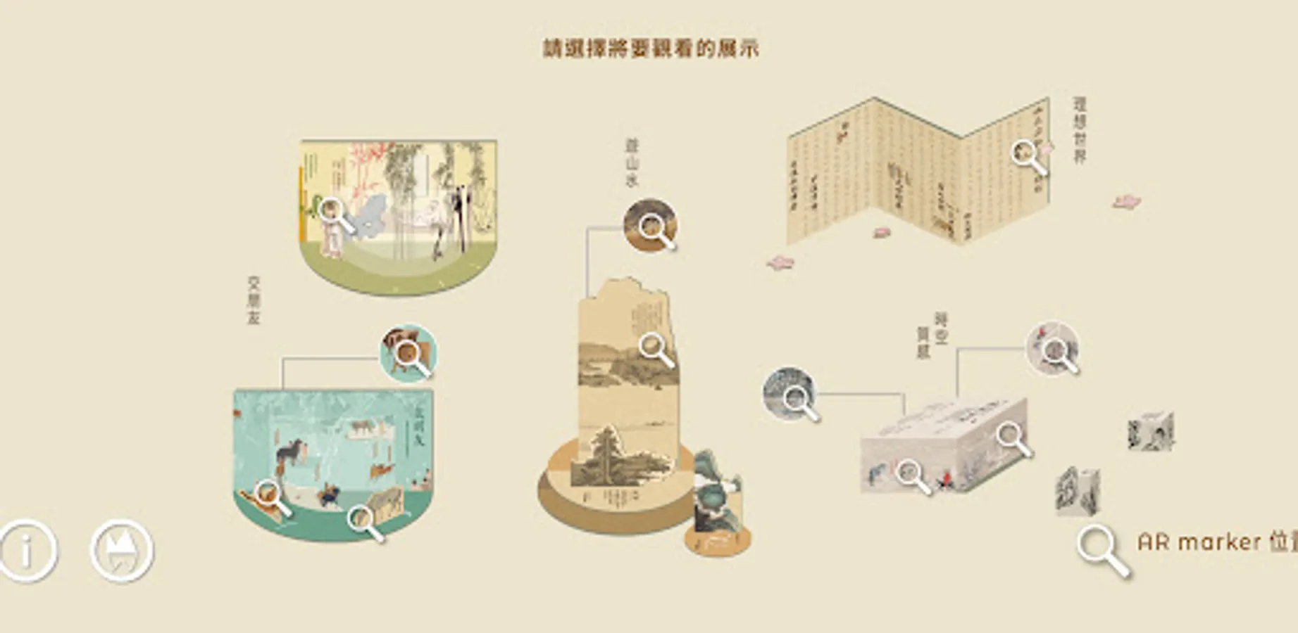 Let us travel through the mountains and rivers of the ancients together through the uniquely designed device, meet their friends, refer to the viewpoints and angles among them, and create our ideal world. To learn the fun and characteristics of traditional paintings, and to discover the meaning and value behind the art collection.