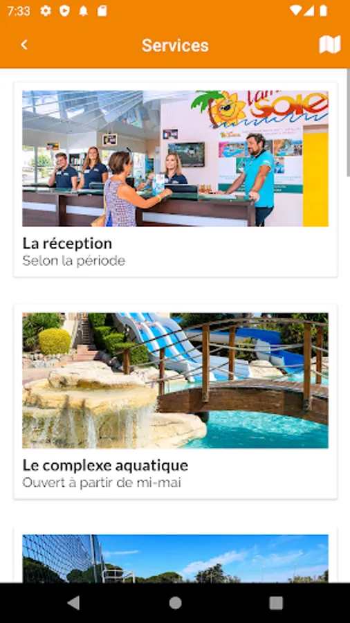 A photo gallery will even give you a sneak preview of the atmosphere of the domain, its water park, its slides or its accommodations: a slideshow of the most beautiful photos of the L'Ami Soleil vacation village of your choice will automatically appear when you tilt your phone. Côte d'azur, Hautes-Alpes, Provence, Hérault ... The most beautiful regions of France will be displayed on this mobile application!
