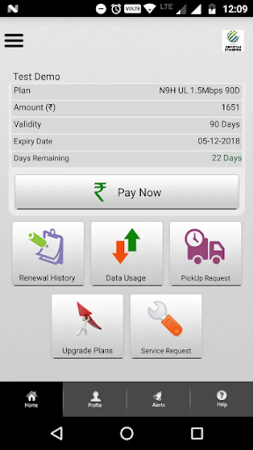 A subscriber can renew broadband account by clicking on the renew now button on the home screen. Payment can be done through credit / debit card, net banking or can put in a payment pickup request to the collection team for making a cash or cheque payment.