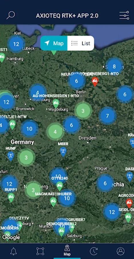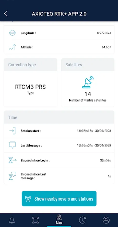 Dedicated to the AXIOTEQ owners, this App allows to check the status of all reference stations worldwide. In addition, it allows to check the status of each rover. By clicking on a rover, a detailed window pops-up displaying lot of information of the rover. This helps the user of the App to see the status of the rover, the number of satellites used, how long it has been connected...