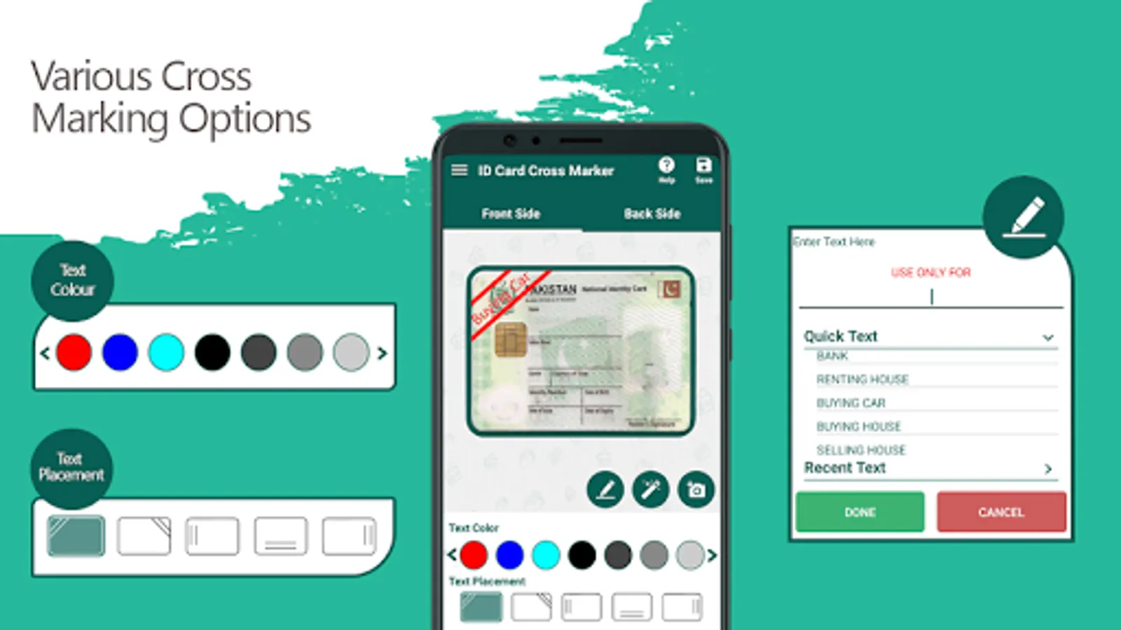 Do you want to protect your ID card or CNIC, business cards, driving license, passport, employee cards, smart cards, and many more from unauthorized use? Are you looking for a way to protect it digitally by cross marking it? Now you can cross mark and protect your digital image assets in your mobile phone. Using this app, just create and apply editable cross marks on your identity documents. You can make cross-marked cards or photos using this fantastic free visiting card application without buying the expensive one. There are many controls and effects in the NIC CROSS MARKER APP to create your customized cross mark, which you can rotate, resize, flip, save, and share on any shareable platform directly from the app. Get started now!