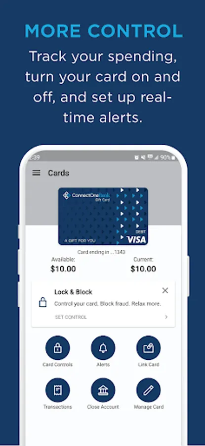 This app can only be used to manage your ConnectOne Bank Visa® Gift Card. To manage your ConnectOne Bank accounts, download the ConnectOne Bank Mobile app or the ConnectOne Bank Business app. To manage your debit card, download the ConnectOne Bank MyCard Manager app.