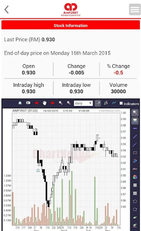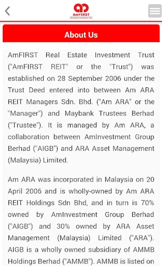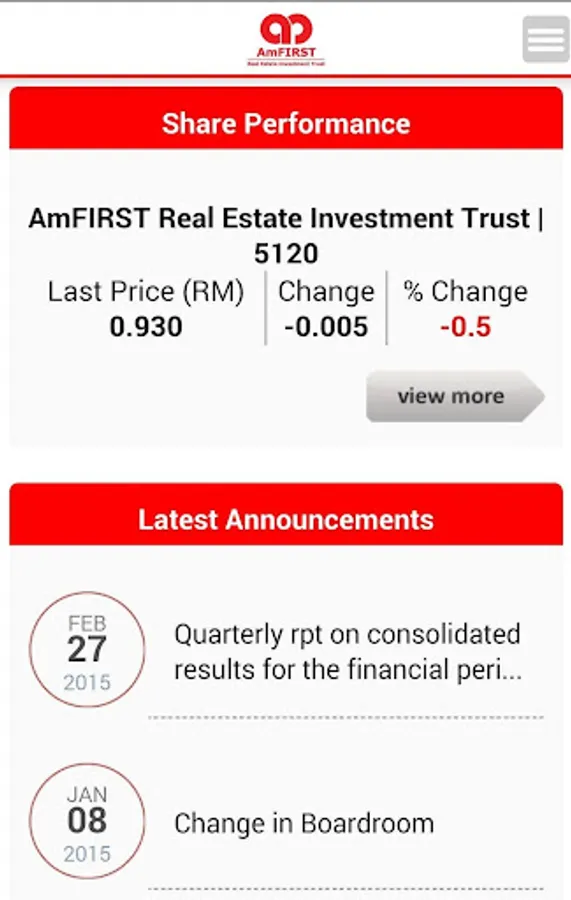 The AmFIRST REIT Mobile Investor Relations (IR) App is designed with the above said in mind. It will allow the users to be notified and updated with crucial and essential information that are released to the Malaysia Stock Exchange, Bursa Malaysia Berhad. These include financial information, company reports, stock information, stock chart as well as company announcements. This is the perfect platform to have key information made available right in the palm of investors and users. All the information is updated instantly and as and when the company releases the relevant to Bursa Malaysia.