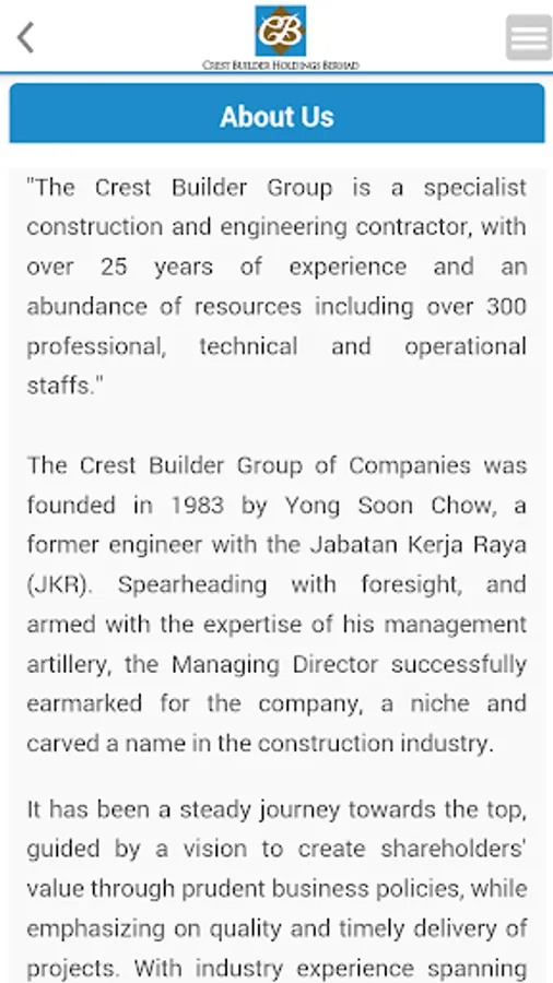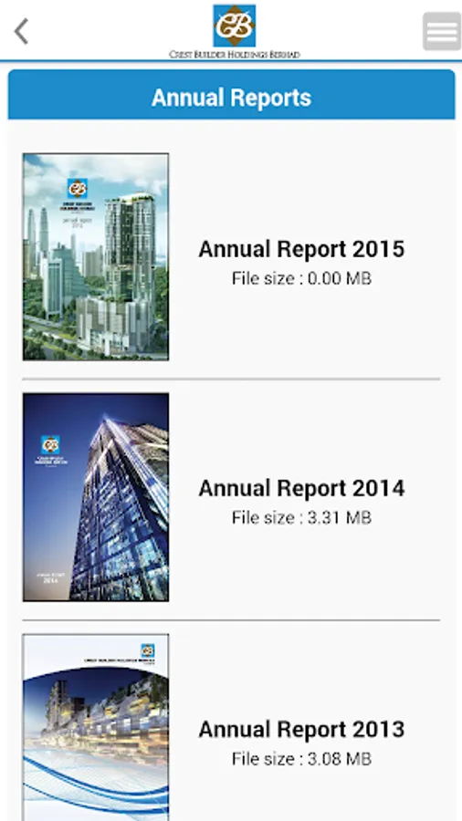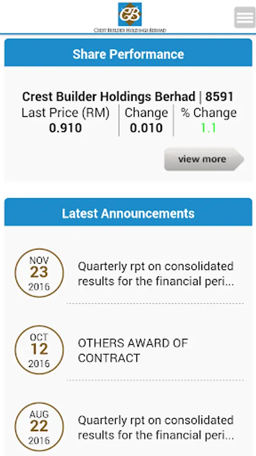 The Crest Builder Holdings Berhad Mobile Investor Relations (IR) App is designed with the above said in mind. It will allow the users to be notified and updated with crucial and essential information that are released to the Malaysia Stock Exchange, Bursa Malaysia Berhad. These include financial information, company reports, stock information, stock chart as well as company announcements. This is the perfect platform to have key information made available right in the palm of investors and users. All the information is updated instantly and as and when the company releases the relevant to Bursa Malaysia.