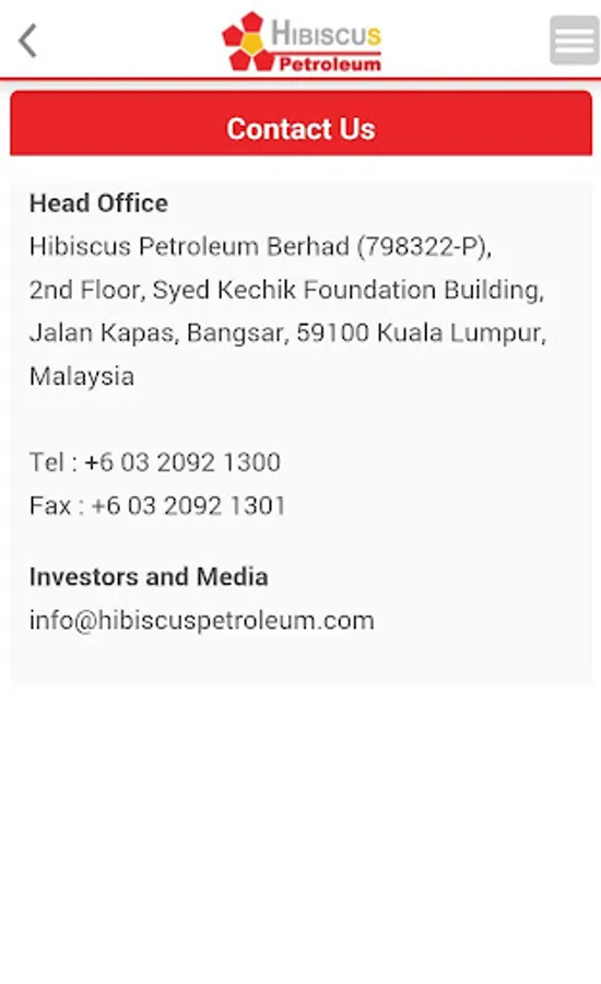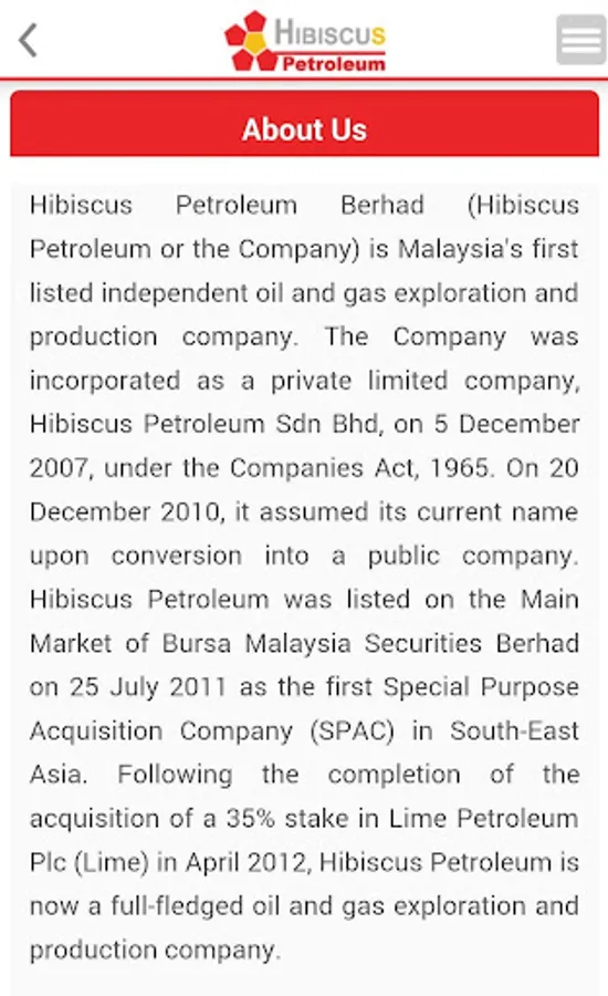 The Hibiscus Petroleum Berhad Mobile Investor Relations (IR) App is designed with the above said in mind. It will allow the users to be notified and updated with crucial and essential information that are released to the Malaysia Stock Exchange, Bursa Malaysia Berhad. These include financial information, company reports, stock information, stock chart as well as company announcements. This is the perfect platform to have key information made available right in the palm of investors and users. All the information is updated instantly and as and when the company releases the relevant to Bursa Malaysia.