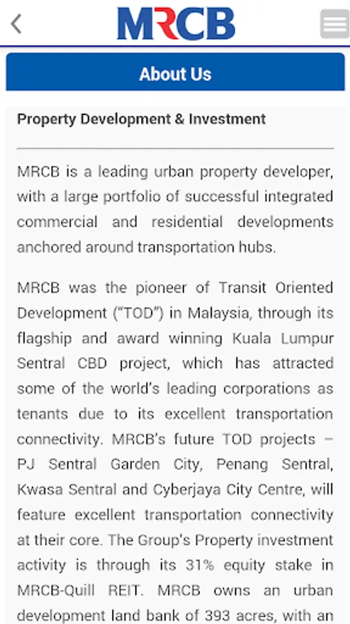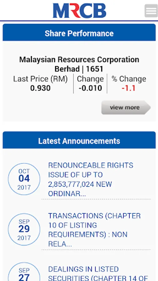 The Malaysian Resources Corporation Berhad Mobile Investor Relations (IR) App is designed with the above said in mind. It will allow the users to be notified and updated with crucial and essential information that are released to the Malaysia Stock Exchange, Bursa Malaysia Berhad. These include financial information, company reports, stock information, stock chart as well as company announcements. This is the perfect platform to have key information made available right in the palm of investors and users. All the information is updated instantly and as and when the company releases the relevant to Bursa Malaysia.