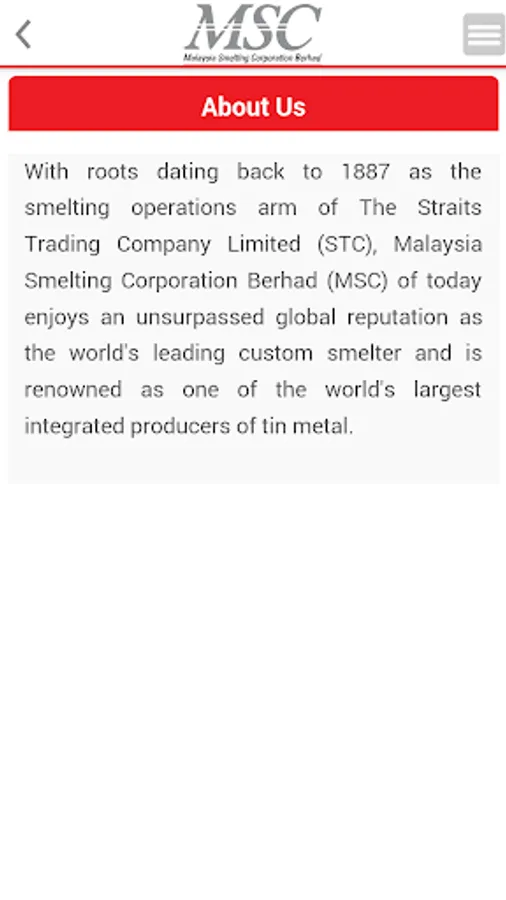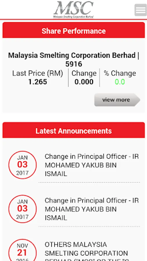 The Malaysia Smelting Corporation Mobile Investor Relations (IR) App is designed with the above said in mind. It will allow the users to be notified and updated with crucial and essential information that are released to the Malaysia Stock Exchange, Bursa Malaysia Berhad. These include financial information, company reports, stock information, stock chart as well as company announcements. This is the perfect platform to have key information made available right in the palm of investors and users. All the information is updated instantly and as and when the company releases the relevant to Bursa Malaysia.