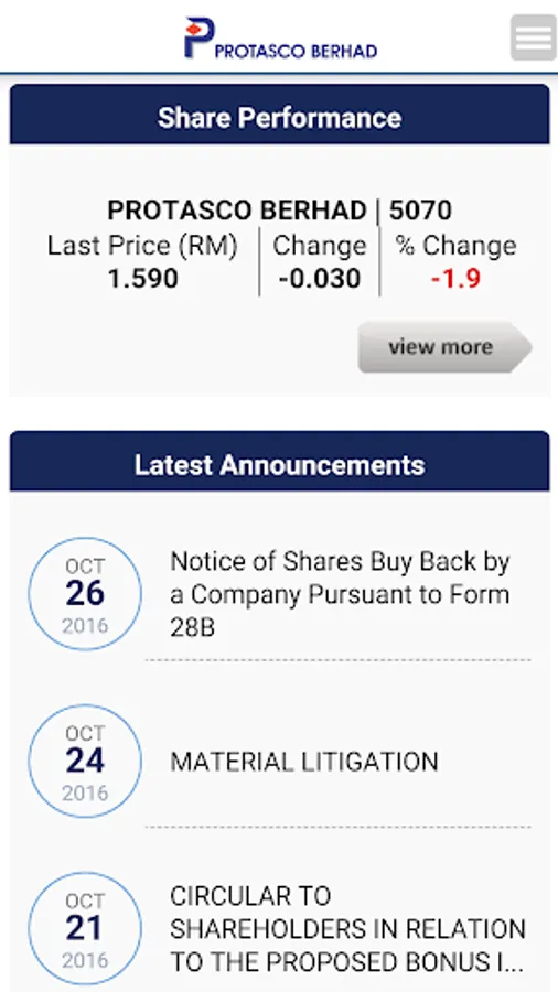The Protasco Berhad Mobile Investor Relations (IR) App is designed with the above said in mind. It will allow the users to be notified and updated with crucial and essential information that are released to the Malaysia Stock Exchange, Bursa Malaysia Berhad. These include financial information, company reports, stock information, stock chart as well as company announcements. This is the perfect platform to have key information made available right in the palm of investors and users. All the information is updated instantly and as and when the company releases the relevant to Bursa Malaysia.