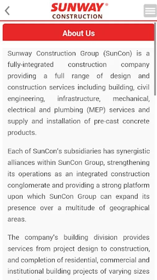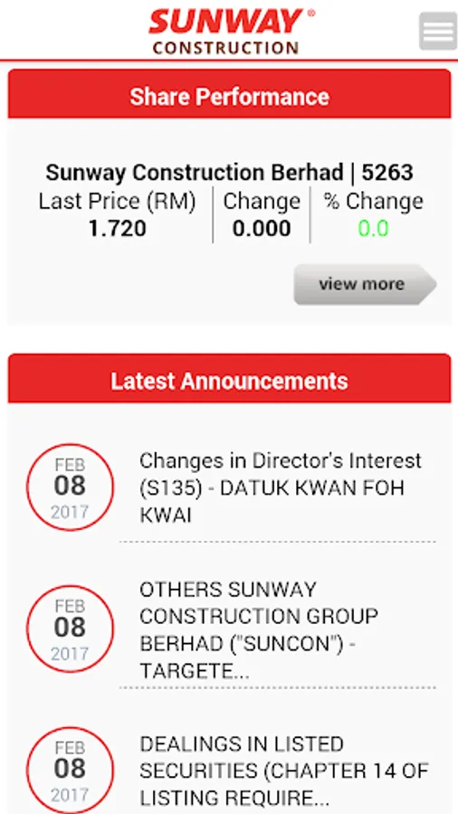 The Sunway Construction Berhad Mobile Investor Relations (IR) App is designed with the above said in mind. It will allow the users to be notified and updated with crucial and essential information that are released to the Malaysia Stock Exchange, Bursa Malaysia Berhad. These include financial information, company reports, stock information, stock chart as well as company announcements. This is the perfect platform to have key information made available right in the palm of investors and users. All the information is updated instantly and as and when the company releases the relevant to Bursa Malaysia.