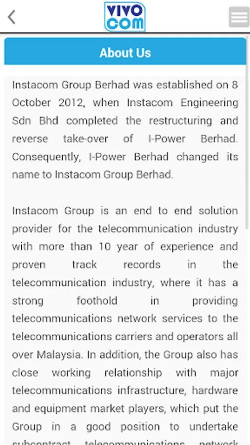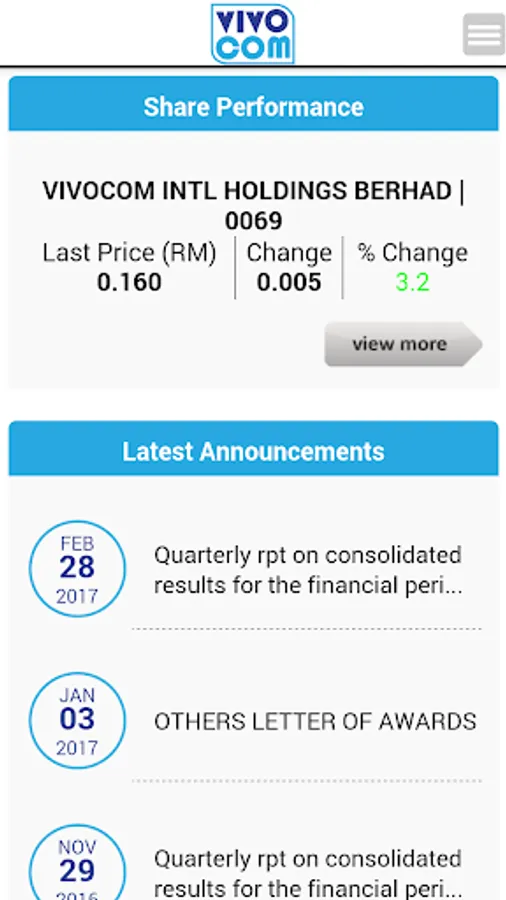 The Vivocom Intl Holdings Berhad Mobile Investor Relations (IR) App is designed with the above said in mind. It will allow the users to be notified and updated with crucial and essential information that are released to the Malaysia Stock Exchange, Bursa Malaysia Berhad. These include financial information, company reports, stock information, stock chart as well as company announcements. This is the perfect platform to have key information made available right in the palm of investors and users. All the information is updated instantly and as and when the company releases the relevant to Bursa Malaysia.