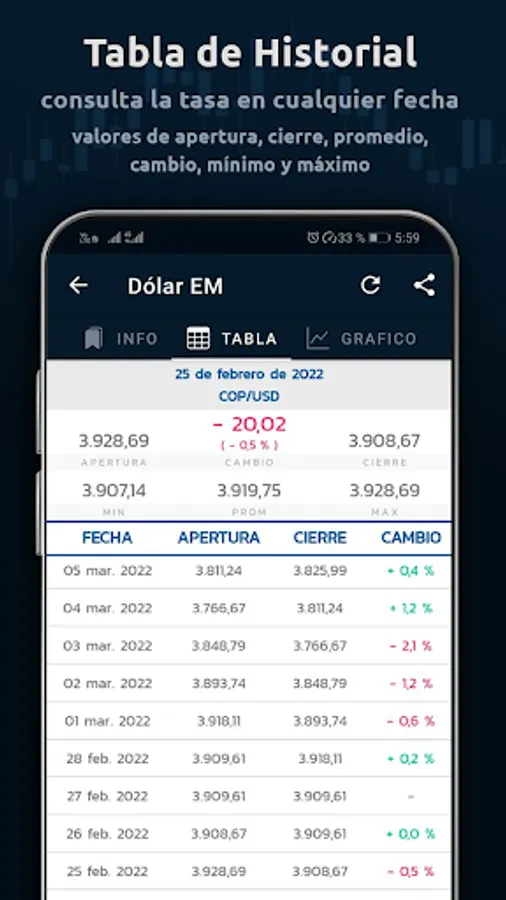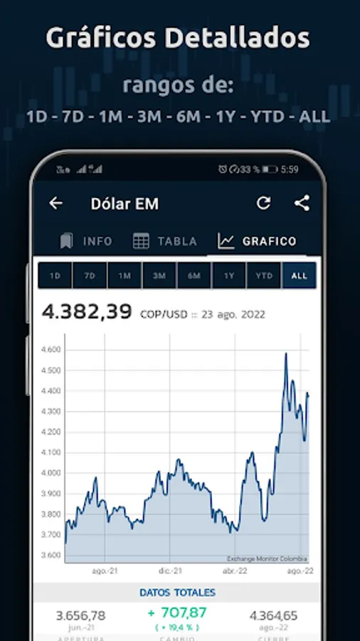 ⭐ Know the daily history and detailed graphs of any reference (dollar in Colombia, currency, or cryptocurrency) in an interactive interface that allows you to quickly visualize the required rate or reference in a short time.
