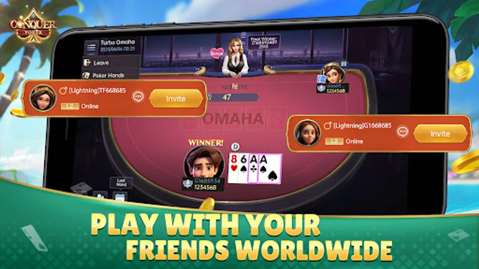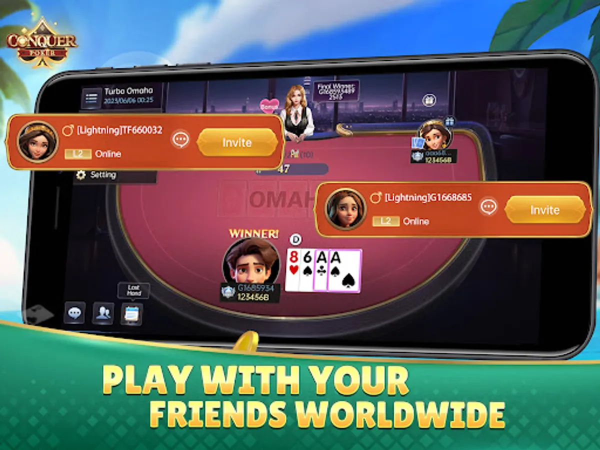 Conquer Poker is a famous free online poker game with more tables, more tournaments and more players. Whether you prefer casual Texas Hold’em poker games or competitive poker tournaments, whether you’re a pro or a beginner, Conquer Poker has the right table just for you. Now play with your friends, family members or any players around the world anywhere and anytime.