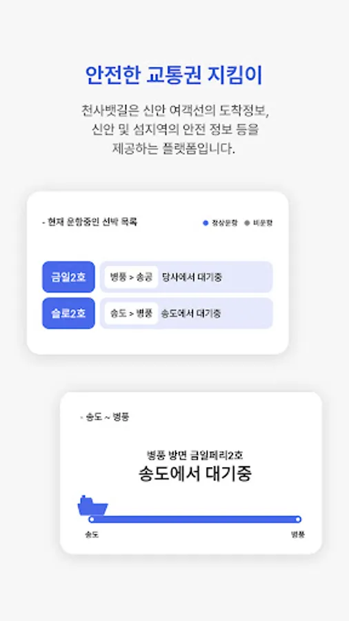 It is an app that guides the arrival time information and safety information of ships operating the pilgrimage route to Seomtiago (Gijomdo, Soakdo) and Mandrami Island (Byeongpungdo) in Sinan-gun, Jeollanam-do.