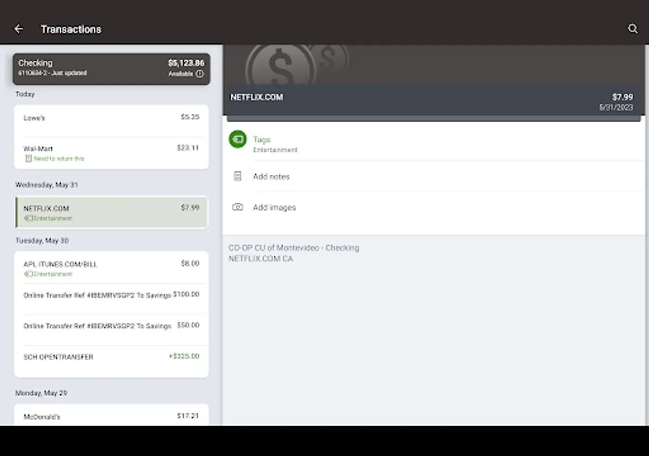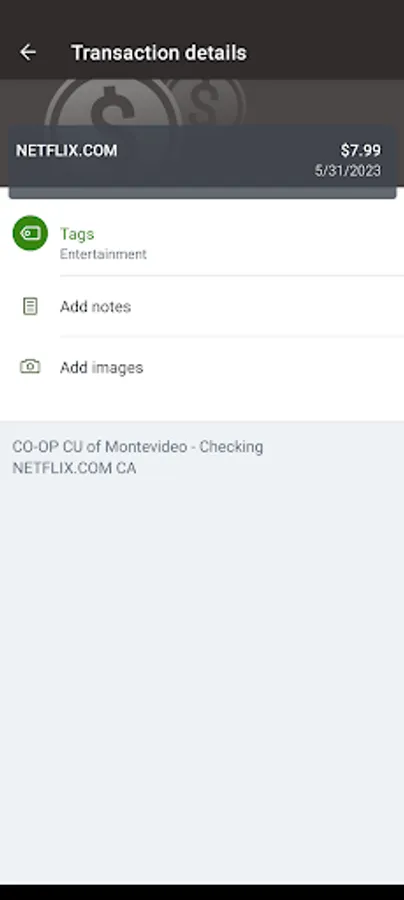 - Keep your transactions organized by allowing you to add tags, notes and photos of receipts and checks.