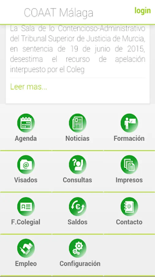 With the installation of App COAAT Malaga, the user may have a number of institutional generic content, accessible to anyone interested, regardless of who holds the position of referee, while using private keys, associate members of the College also have access to a range of content and services specifically for them, and can customize the information they want to receive college through alerts through the app: training, visas, employment, circular ...