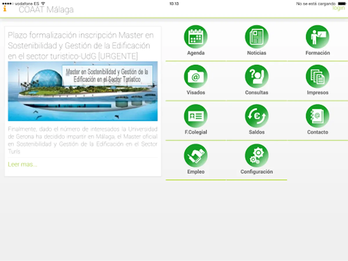 App of the College of Technical Architects of Malaga for mobile devices, a useful online tool that will allow colleges to access from anywhere at any time of day, a variety of college services quickly and simply.