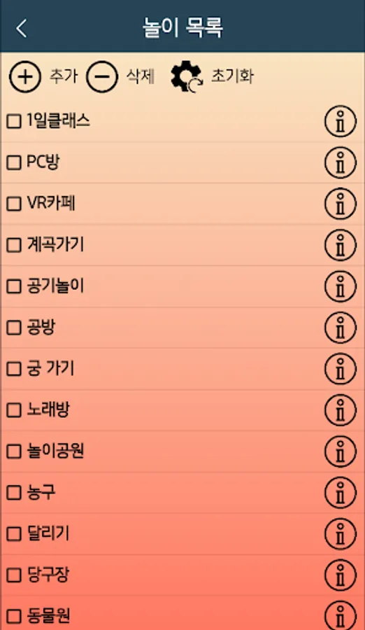 놀이 목록을 여러분이 원하는대로 추가, 삭제, 수정하여 여러분에게 맞는 놀이목록을 만들수도 있습니다.