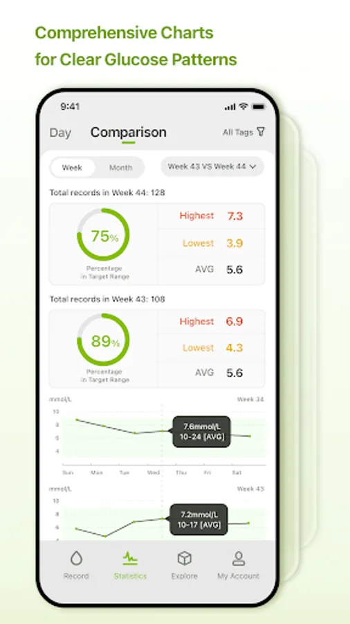 ● Check your blood sugar patterns week-over-week, month-over-month at a glance. We draw the charts for you.