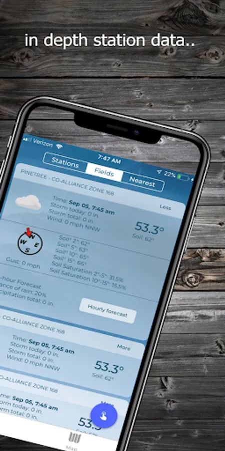 A user interface for DataOnTouch customers to view local weather station data, including current conditions, precipitation, wind speeds, and soil temperatures.