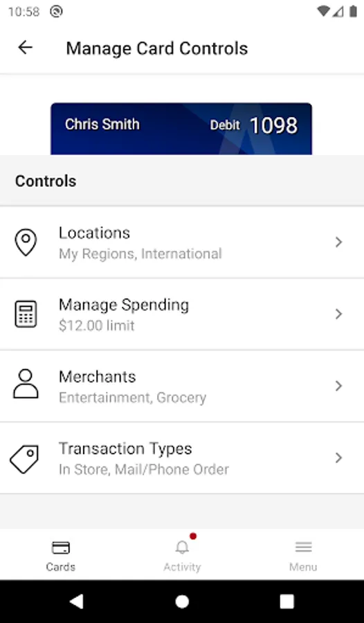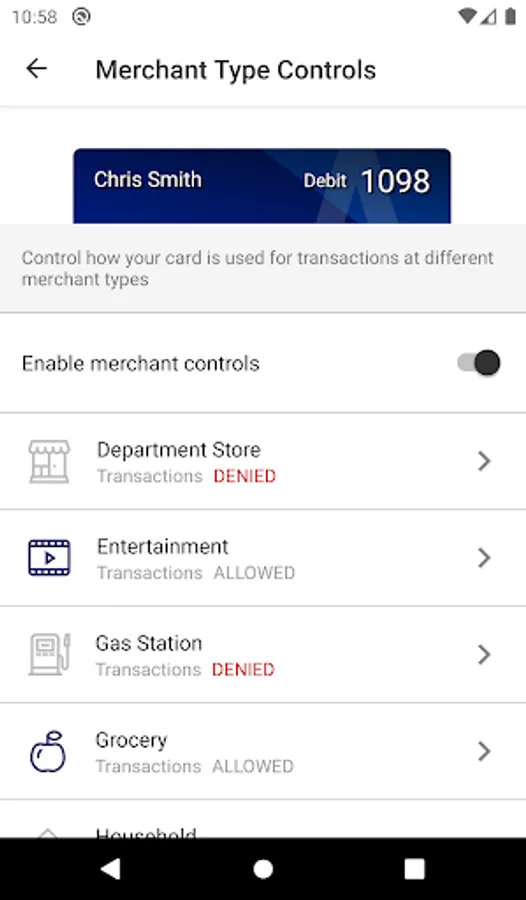 Spending limits can be established to allow transactions up to a certain dollar value and decline transactions when amounts exceed your defined thresholds. Transactions can be monitored and managed for specific merchant categories such as gas stations, department stores, restaurants entertainment, travel, and groceries. And your transactions can also be monitored for specific transaction types: in-store purchases, e-commerce transactions, mail/phone orders and ATM transactions.