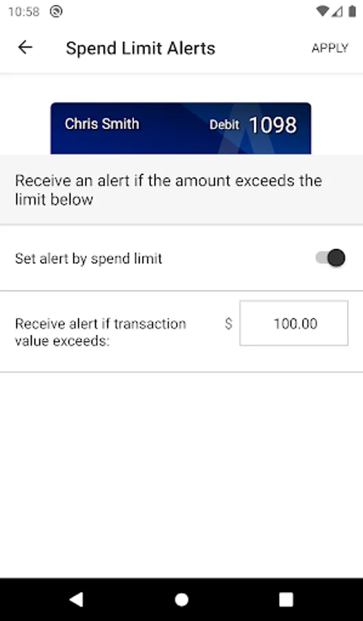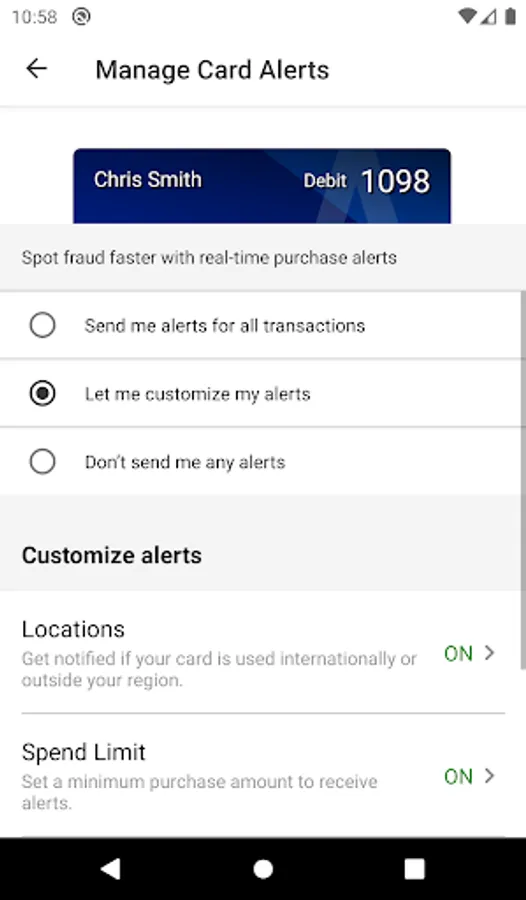 Alerts for PIN and signature transactions can be set up to keep you informed of your debit and credit card usage and help you quickly detect unauthorized or fraudulent activity. This app can send an alert when a card is used or when a card transaction has been attempted but is declined – and additional customizable alert options are available. Alerts are sent in real time, immediately after a transaction has taken place.