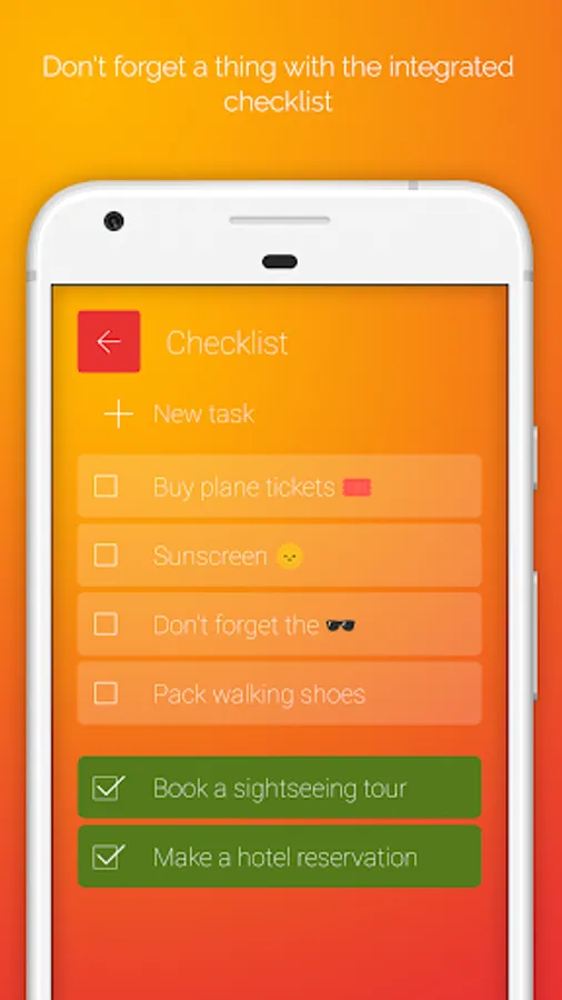 Check the temperature and weather indicator to pack accordingly. Don’t forget a thing with the integrated travel checklist. Use the reminders to complete your tasks in time.