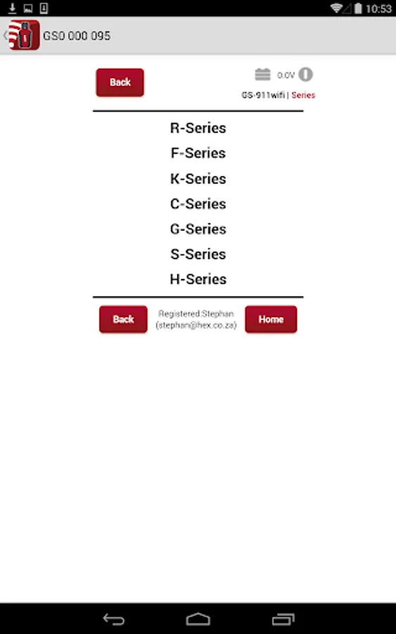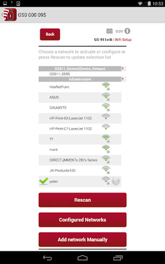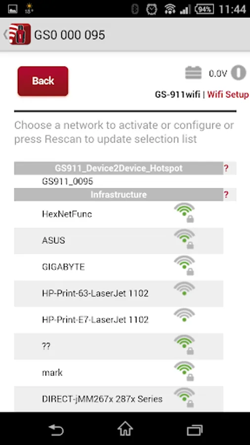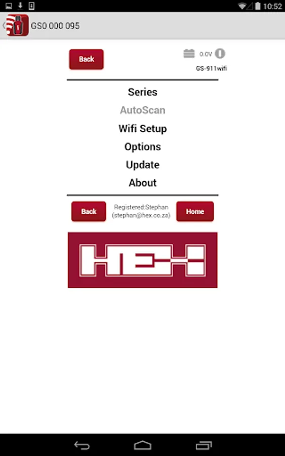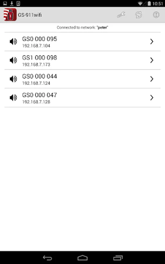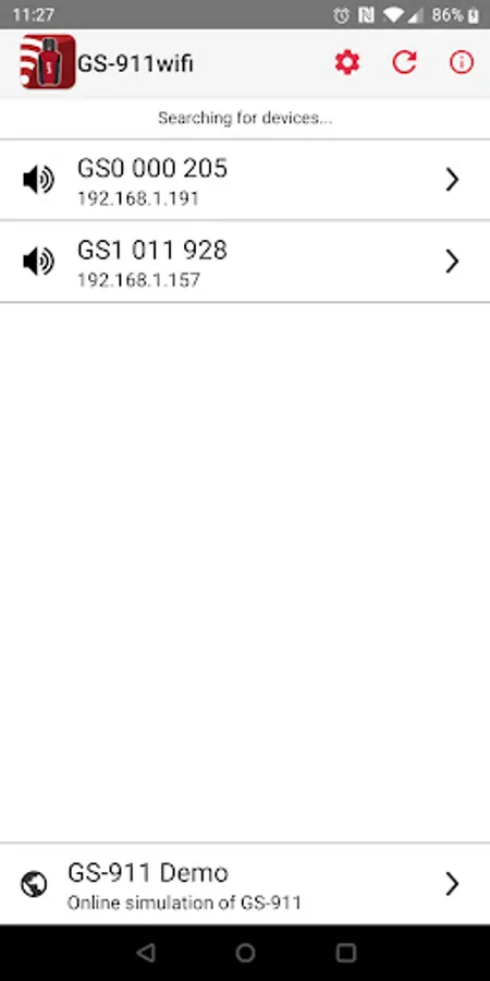 The GS-911wifi app is a Android utility that searches for any GS-911wifi diagnostic interfaces on your wifi network. It lists all GS-911wifi interfaces, showing their IP address and Serial number, allowing you to click on a specific interface to select it. Selecting a device will launch the default browser to the selected IP address.