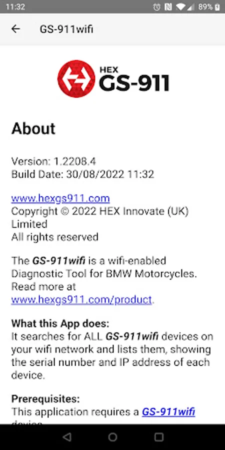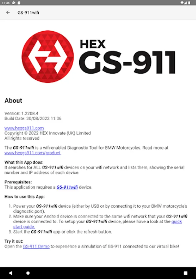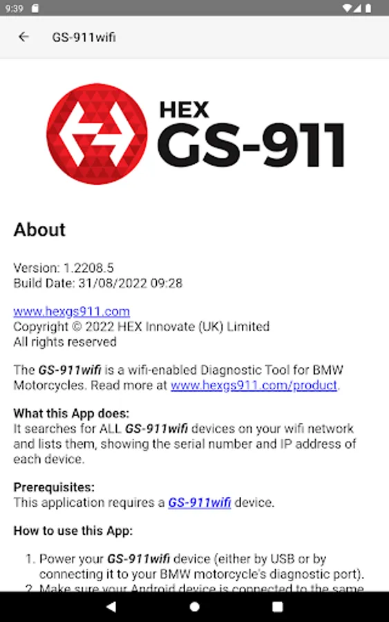 GS-911wifi is an app for BMW motorcycles. It requires a HEX GS-911wifi diagnostic interface.