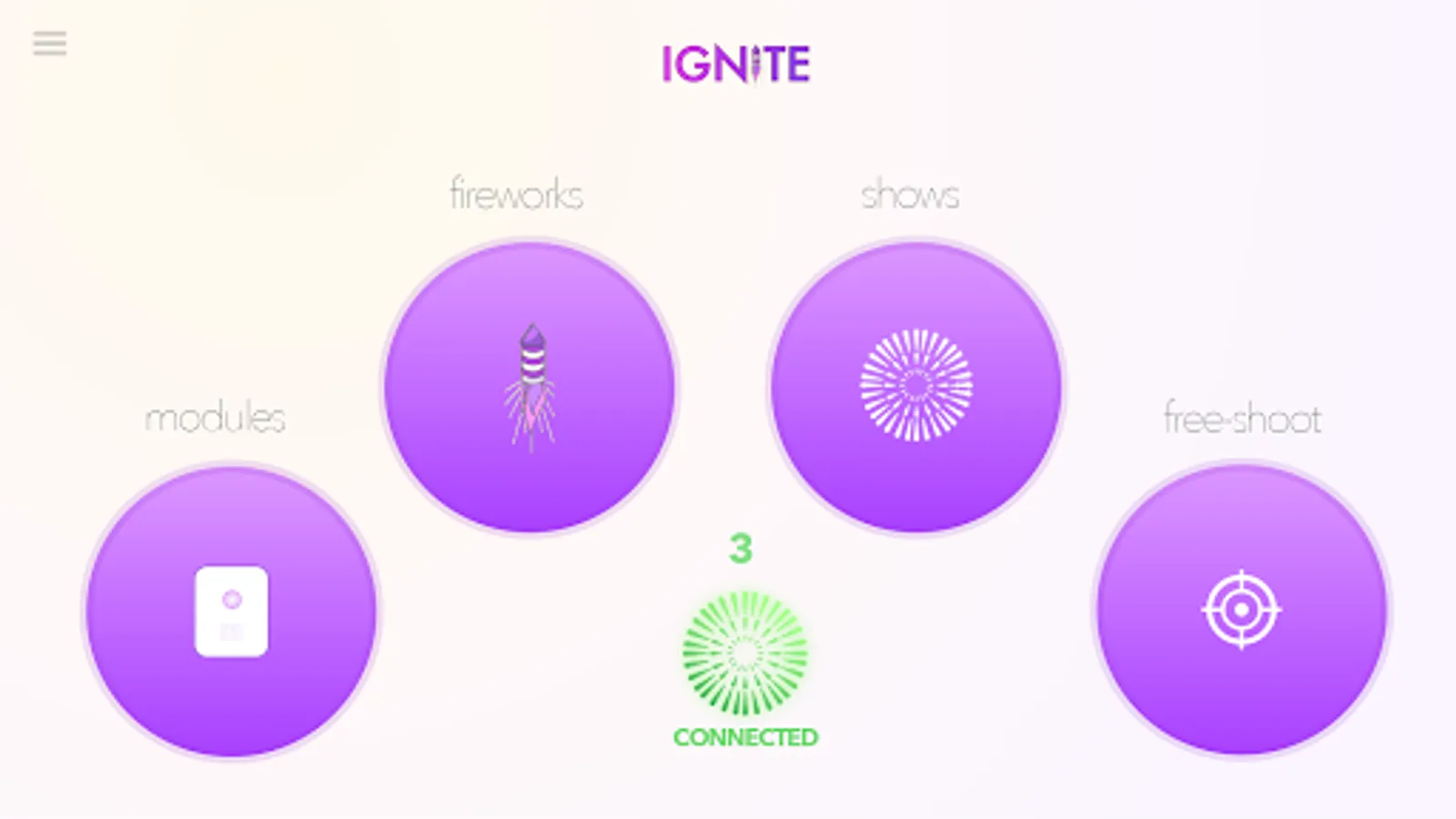 The IGNITE main menu provides access to the four app sections including modules, fireworks, free-shoot and shows, explained below.