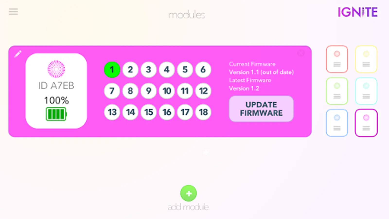The modules section allows you to pair up to six IGNITE i18 firing modules for a maximum of 108 cues. You can also view battery life, which cues have igniters connected, and module color.