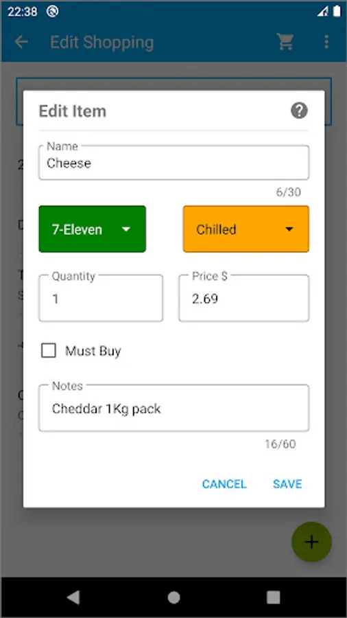 Add items to lists with shop, category, quantity, notes, and mark as "must buy".