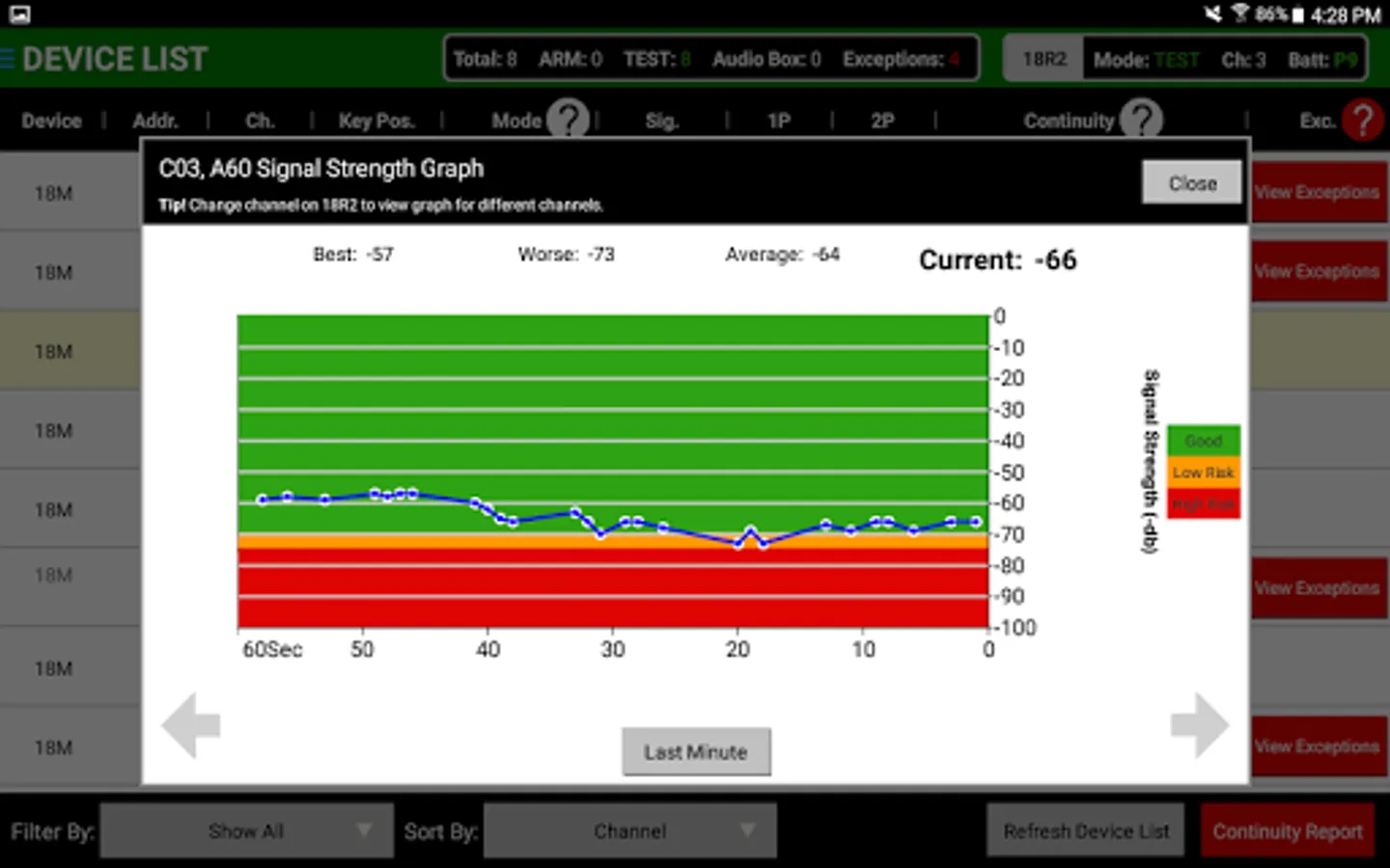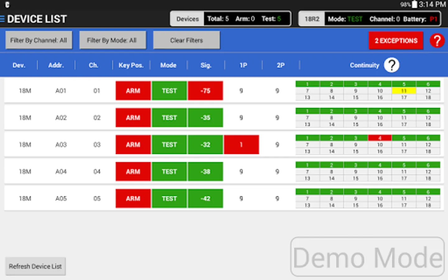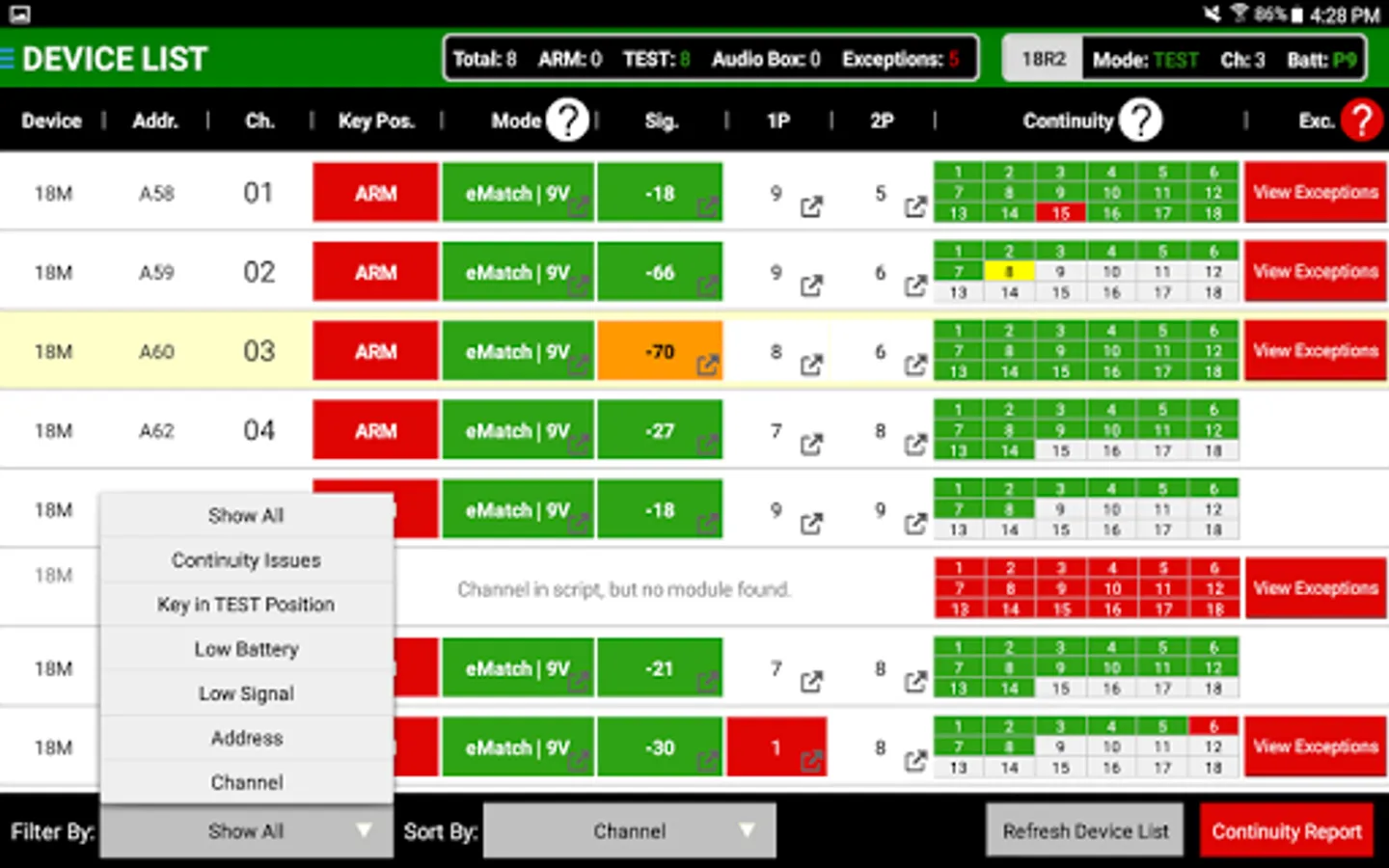 Device List - Detailed listing of modules including channel, address, key position, mode, signal strength, battery levels and continuity.