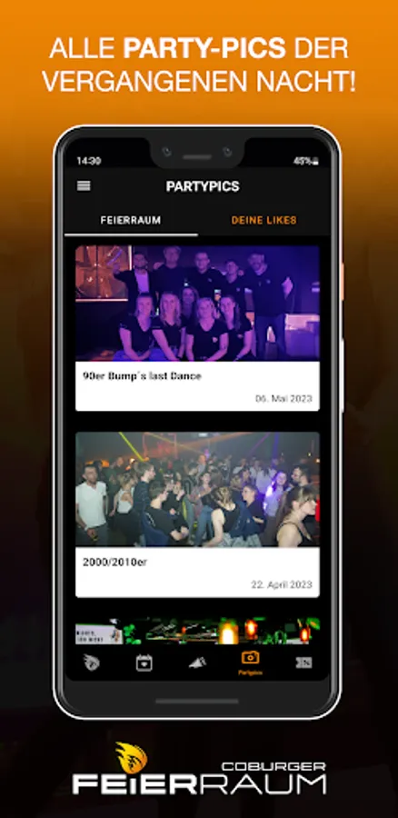 You'll be the first to know when the next party is on and you'll benefit from great promotions. You save money with our vouchers for the event. We provide all the party pics in the app so that you can remember the awesome evening the day after.
