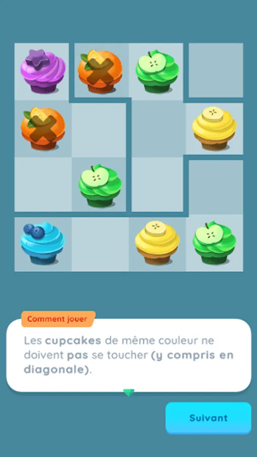 Fill in the grid, but make sure that 2 same color cupcakes do not touch each other.