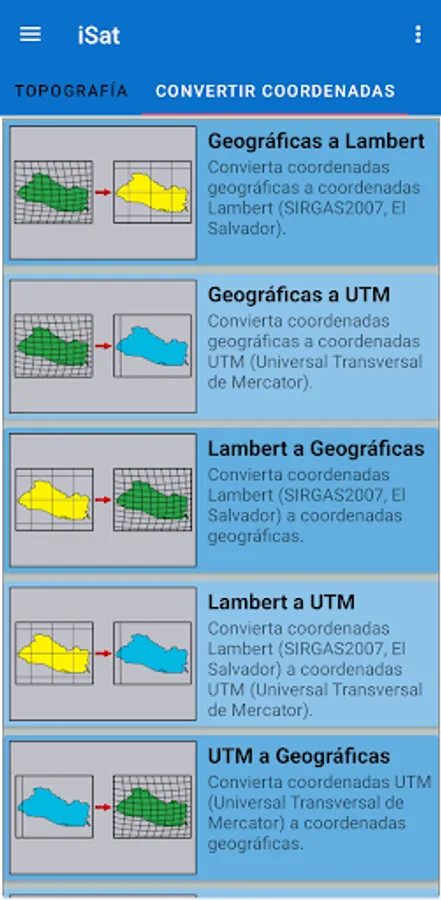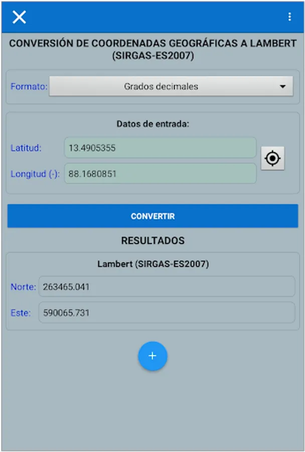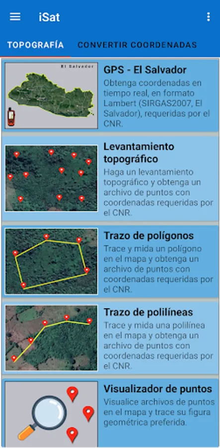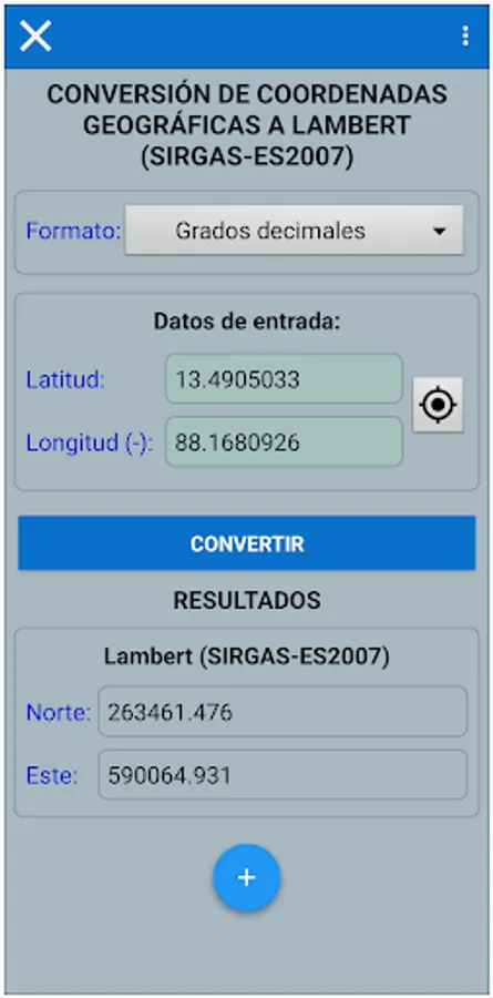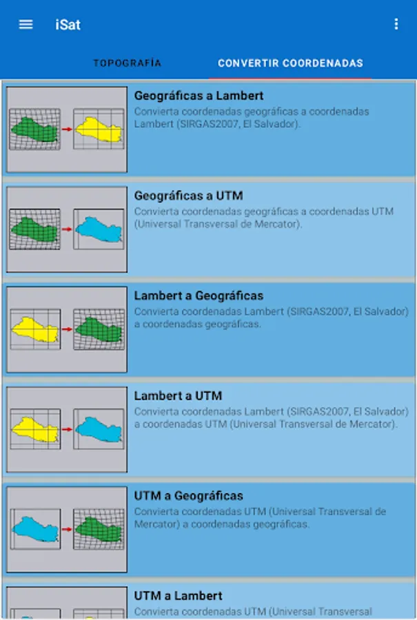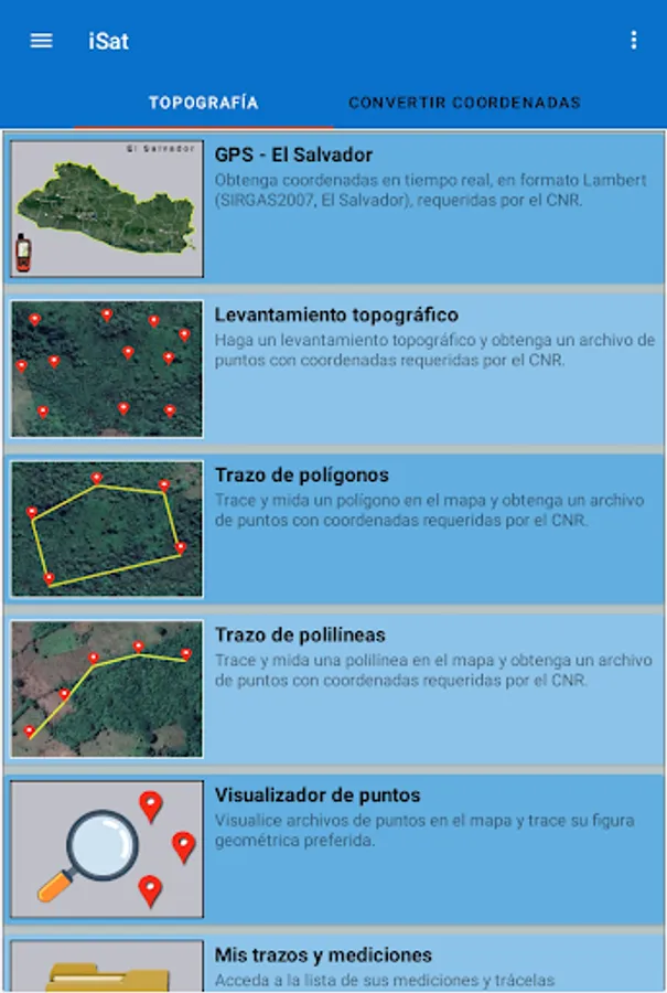 Also, use your device as a GPS to get Lambert coordinates (SIRGAS2007, El Salvador), in real time.