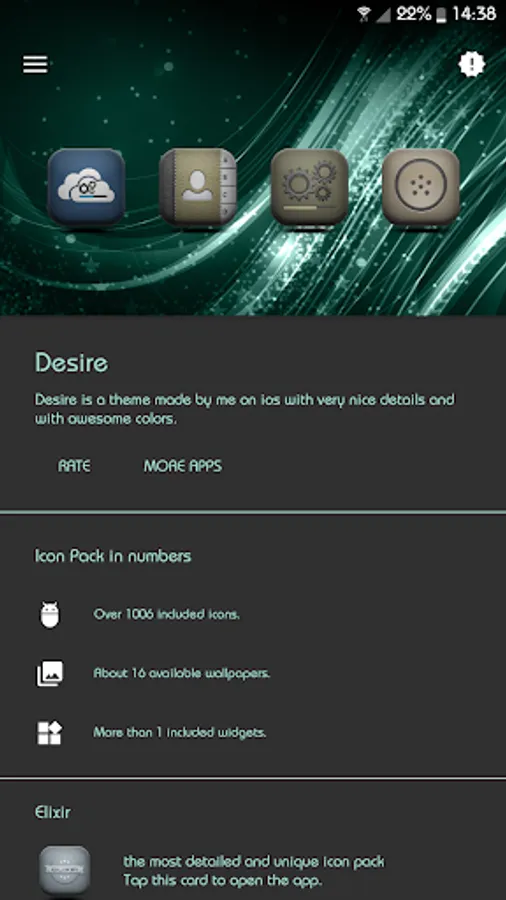 •Desire icons have been designed from the ground up using nice colors with beautiful details and an nice shadow on the bottom if each icon.I start this theme on ios a few years ago and now i bring it to android platform.