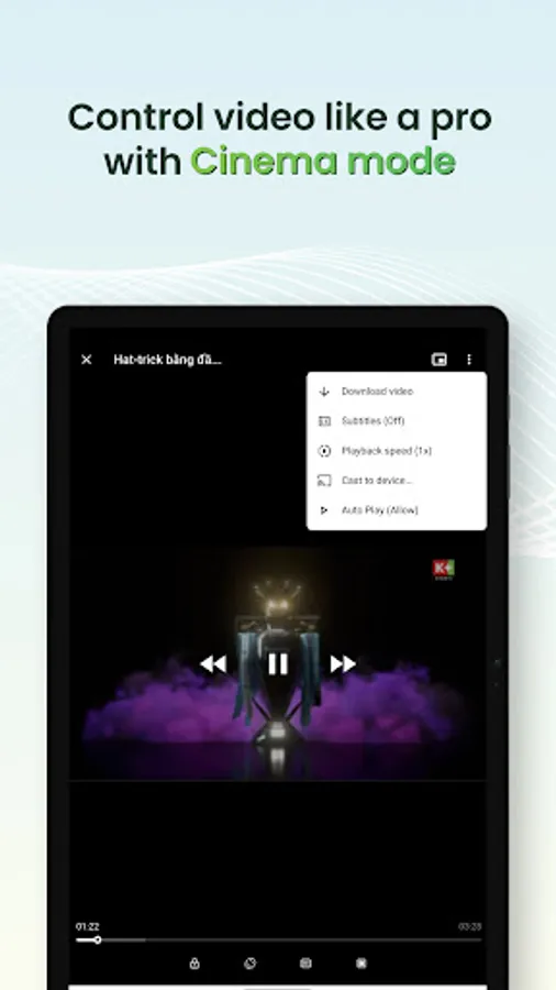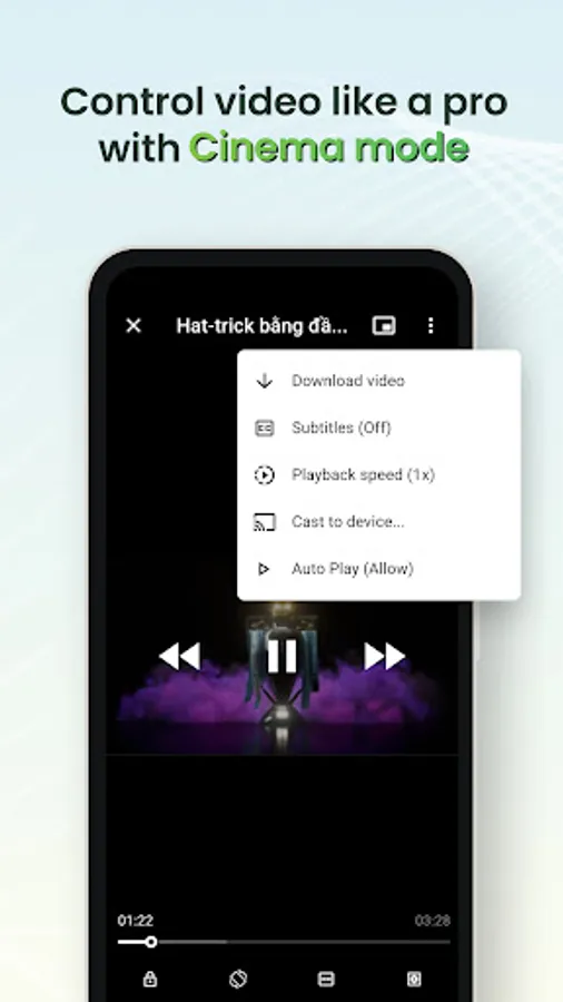 - Cinema Mode: Watch video in fullscreen mode and personalize your experience with advanced settings such as adjusting volume, brightness and seeking in video using touch gestures; disabling touch gestures; selecting play speed, screen ratio, subtitles and setting sleep timer.