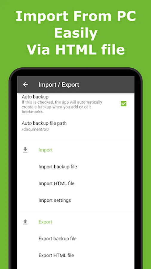 - Via HTML bookmark file, you can import bookmarks easily from your PC browser.