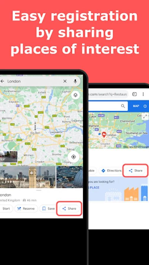- Easily register a place data by sharing it with this app from map apps and web search results.