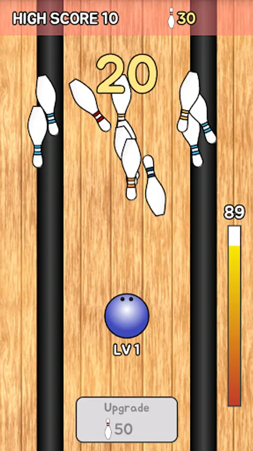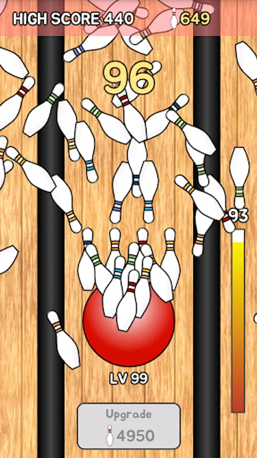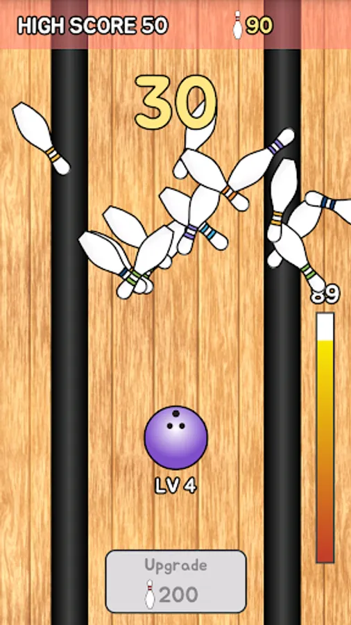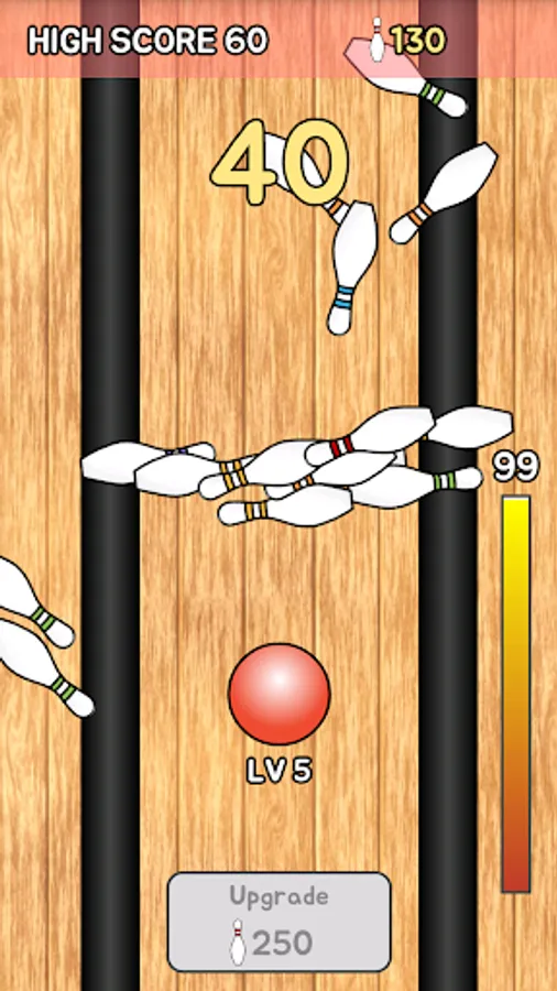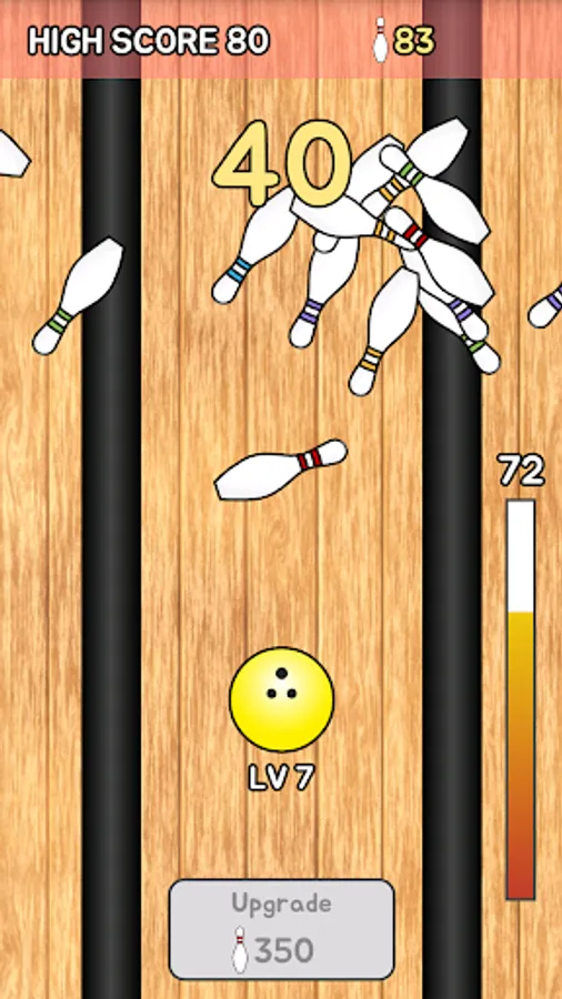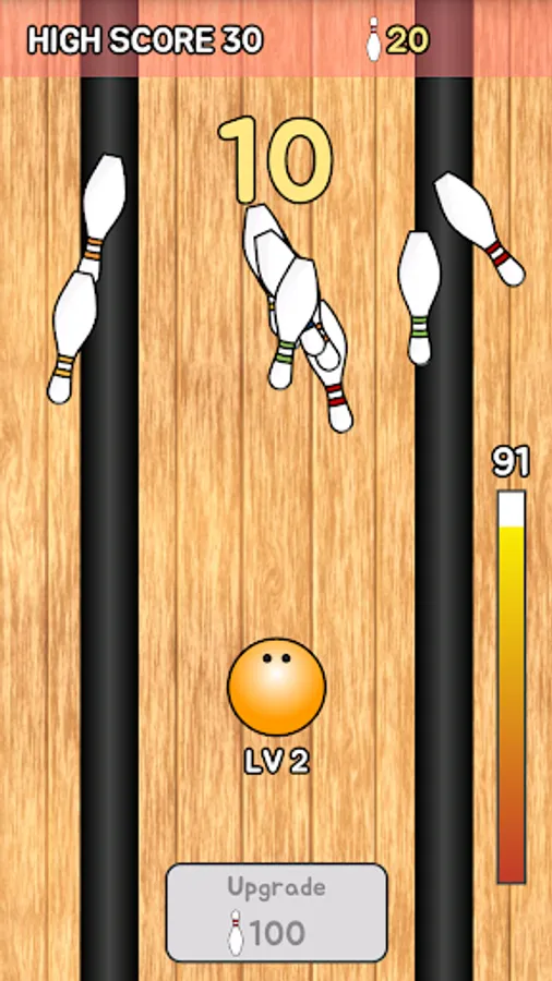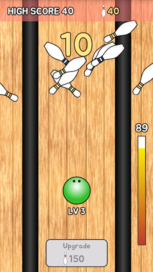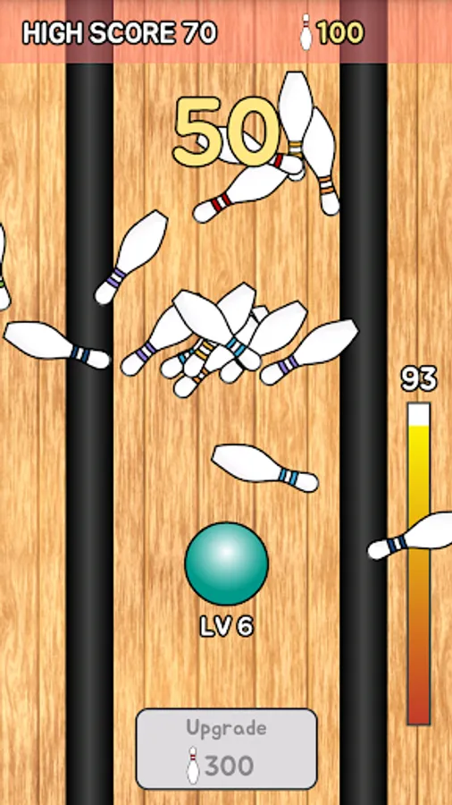 You can also upgrade your bowling ball using the points acquired by knocking down bowling pins. If bowling ball is upgraded, not only rolls farther, but also is changed color and size.