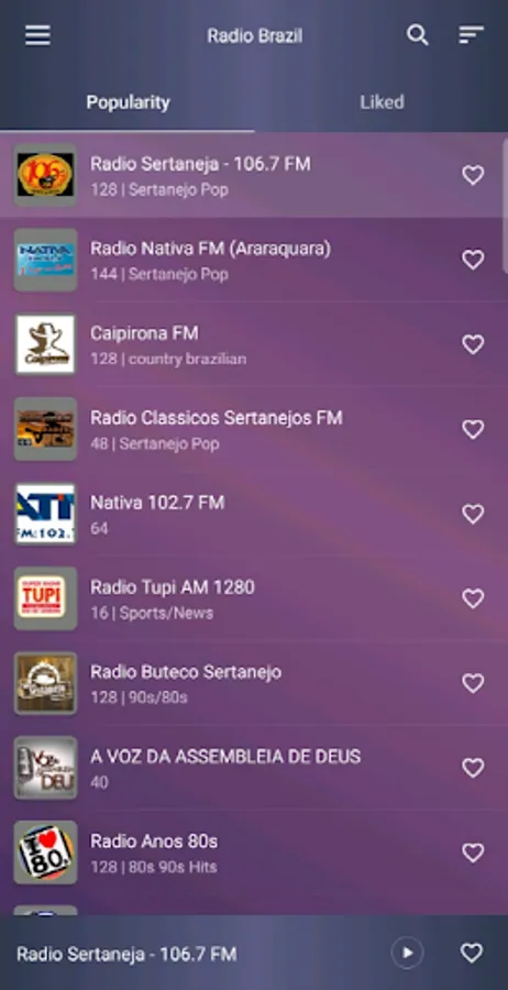 Radio Sertaneja - 106.7 FM, Caipirona FM, Nativa 102.7 FM, Radio Nativa FM (Araraquara), Radio Buteco Sertanejo, Radio Anos 80s, Radio Tupi AM 1280, Radio Antena 1 / Rede, Radio Classicos Sertanejos FM, Radio Mucao, A VOZ DA ASSEMBLEIA DE DEUS, Rádio Mil Glórias, MGT Radio Sertaneja, Jovem Pan FM Belo Horizonte, Radio So Brega, Radio Saudade FM - 100.7 FM, Globo FM, FM O Dia, Rádio Peão Goiás, CBN Sao Paulo, Radio Sertaneja Raiz, Radio Love Cidade, Jovem Pan FM Florianopolis, Paredao Piseiro, Antena 1 / Sao Paulo 94.7, Radio So Forro Juazeiro Do Norte, Radio Sensorial FM, ZYC690 - Radio BH FM, Radio Pagode, Radio JBFM - 99.9 FM, ...