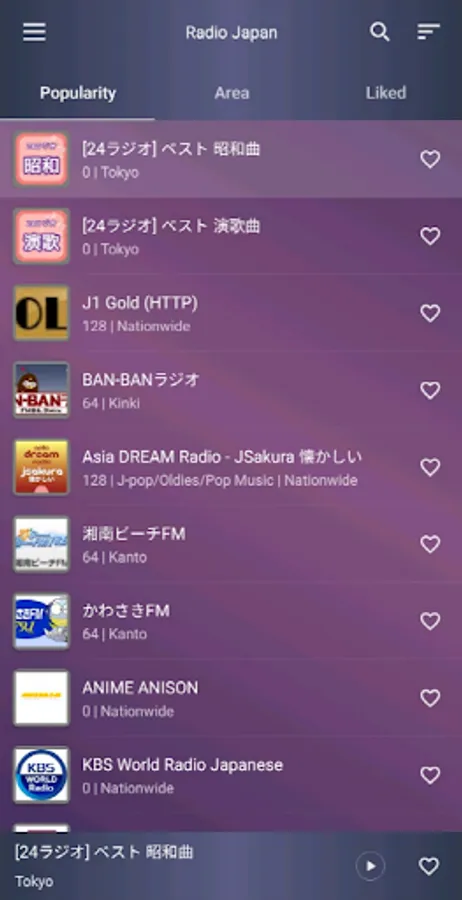 [24ラジオ] ベスト 昭和曲, [24ラジオ] ベスト 演歌曲, Asia DREAM Radio - JSakura 懐かしい, 湘南ビーチFM, Jpop powerplay kawaii, BAN-BANラジオ, KBS World Radio Japanese, かわさきFM, Beam FM - Adult Hits, ANIME FOREVER, Nippon News 24 TV, J-Idols Project Radio, J1 Gold (HTTP), FMいわき, ゆめのたね放送局 Dream Channel, ラヂオきしわだ 79.7, 神のうちの真のいのち, FMいしがき, Asia DREAM Radio - JPop Power play, まえばしCITYエフエム, ENERGY98 98.0, 九州/沖縄, 調布FM 83.8 FM, FMたいはく, FM Jungle(FMジャングル) 76.4, Asia DREAM Radio - Jazz Sakura, Free FM Tokio, FM K-City 79.1, FMぎのわん (FM Ginowan), あまみFM ディ, ...