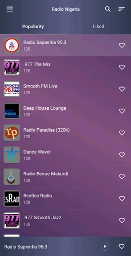 Radio Sapientia 95.3, .977 The Mix, Smooth FM Live, Deep House Lounge, Radio Paradise, Dance Wave, Radio Benue Makurdi, Beatles Radio, .977 Smooth Jazz, LBC Radio, SomaFM Groove Salad, Ambient Sleeping Pill, .977 80s, 181.FM - Old School HipHop/RnB, Dance Wave Retro, .977 Country, .977 Hitz, ...