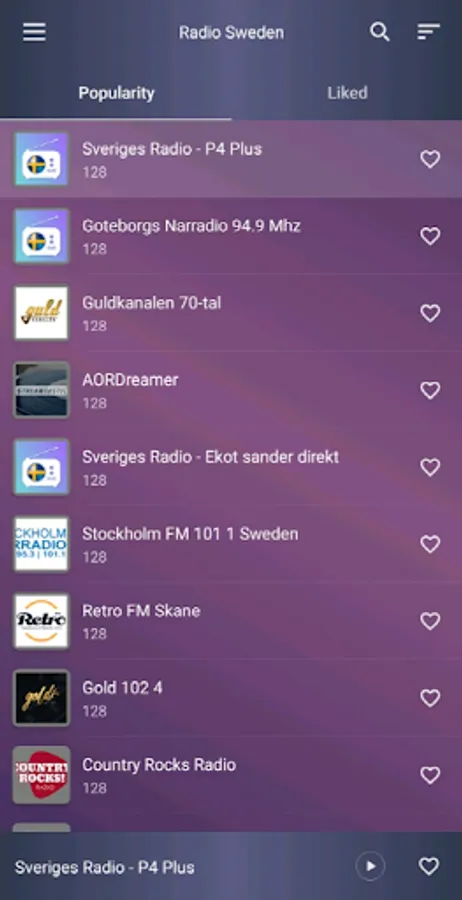 Sveriges Radio - P4 Plus, Goteborgs Narradio 94.9 Mhz, Guldkanalen 70-tal, AORDreamer, Sveriges Radio - Ekot sander direkt, Stockholm FM 101 1 Sweden, Retro FM Skane, Gold 102 4, Country Rocks Radio, Pirate Rock Vastkustens basta rock, Goteborgs Narradio 102.6 MHz, Guldkanalen 80-tal, Pop & Rock, Slay Radio, Radio Sedaie Ashena - FM 94.6 - Stockholm, Lite FM 101.1, The SID Stream, BPM Malmo, Goteborgs Narradio 103.1 MHz, Guldkanalen 90-tal, Radio 88 Partille, 106 7 Rockklassiker, Retreat Radio, Dansbandskanalen, BozRadio, Svensk Folkmusik - AkkA radio, Radio Nacka 99 9, Hitcity, Svensk Pop, Guldkanalen Malmo/Lund, ...