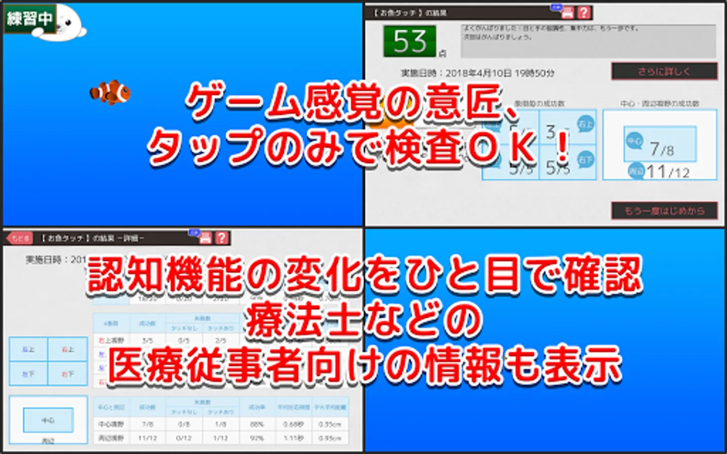 「お魚タッチ」は、ゲーム性のある楽しい検査で脳機能(認知機能:「注意の集中力(注意力)」「反応速度」「目と手の協調性」)を測定し、視覚機能・知覚機能の評価や視知覚トレーニングにご利用いただけます。